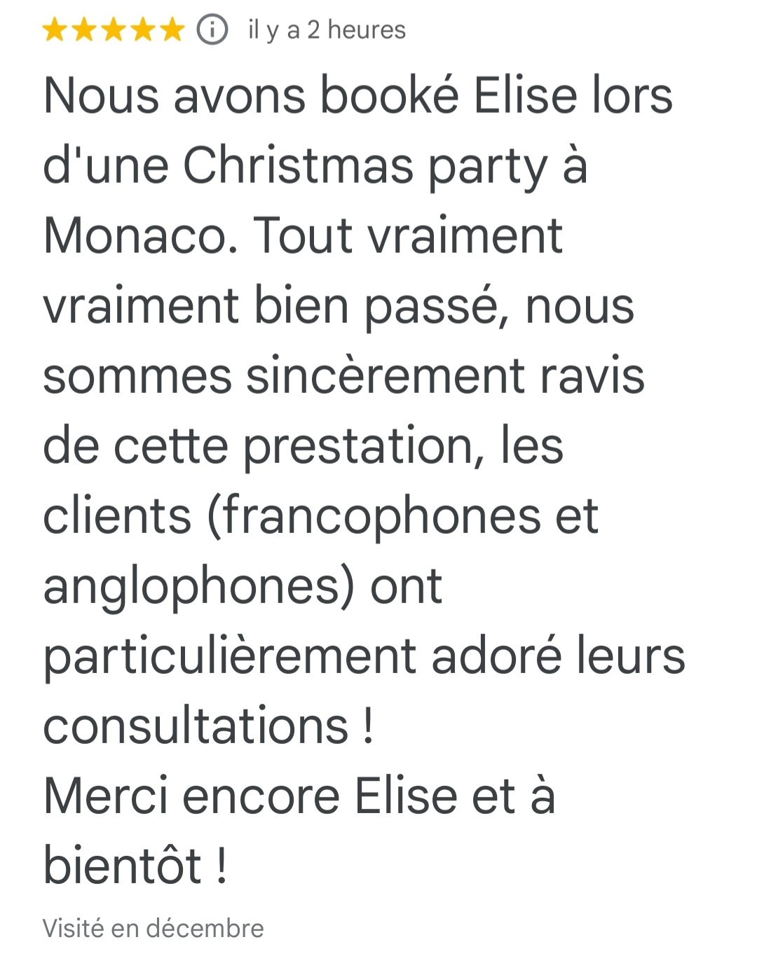 J’ai notamment eu le plaisir de collaborer avec la joaillerie Arije à Monaco, à l’occasion d’un événement de Noël raffiné dans leur boutique. J’ai accompagné leurs clients internationaux à travers 23 consultations individuelles, proposées en français et en anglais.