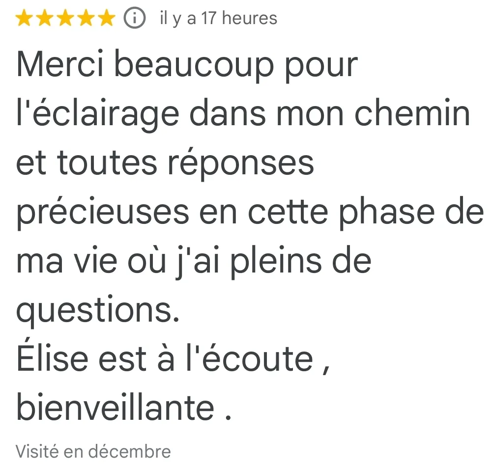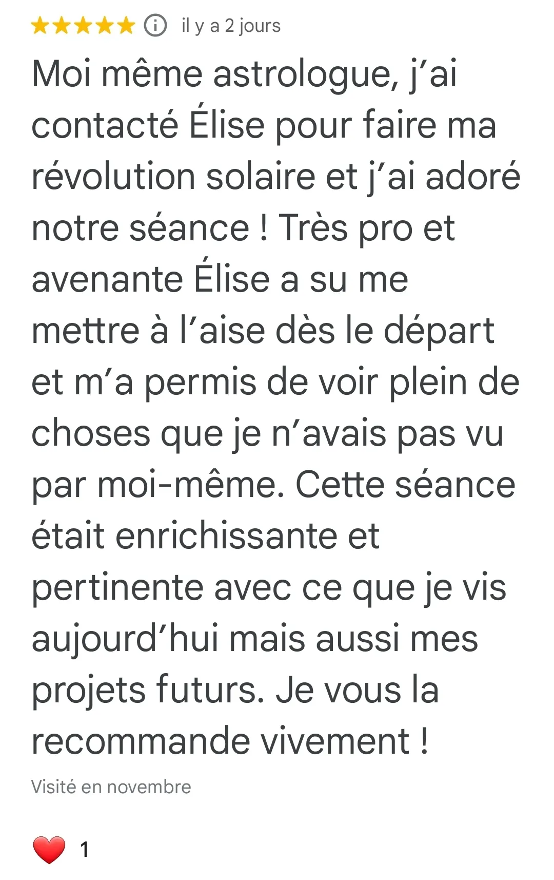 Mes clients d’astrologie ont en commun une envie de mieux se connaître, de se découvrir ou de se redécouvrir sous un angle différent, pour avancer en conscience sur leur chemin de vie. J’ai à cœur de leur permettre de repartir avec des éléments précieux sur eux-mêmes, leur présent et leurs perspectives pour l’avenir. Après une analyse préalable et approfondie de leur thème astral, la séance me permet de partager avec eux ce que j’ai découvert des énergies qui les habitent, de leur fournir des informations concrètes, des dates clés basées sur le mouvement des planètes ainsi que des pistes de réflexion. Sur cette page, ou sur ma fiche Google, découvrez les témoignages de mes clients après leur consultation d’astrologie.